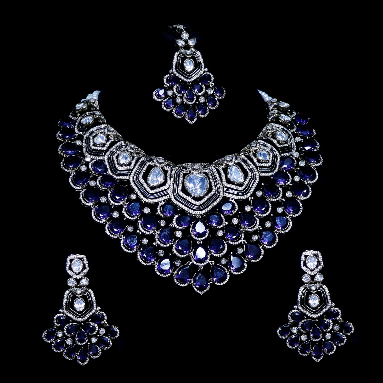 An imperial masterpiece drenched in deep sapphire blues, this Polki set carries the soul of a bygone era. Each sapphire glows with a royal, igniting brilliance, while the Polki work adds an air of timeless grandeur. Crafted in an old-world silhouette, the piece whispers stories of vintage courts, royal soirées, and heirlooms passed through generations. A treasure where classic artistry meets unforgettable blue fire.