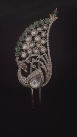 This is a traditional Peacock Kalgi, an ornate turban ornament crafted with kundan-set white stones and emerald accents, symbolizing royalty and grace.