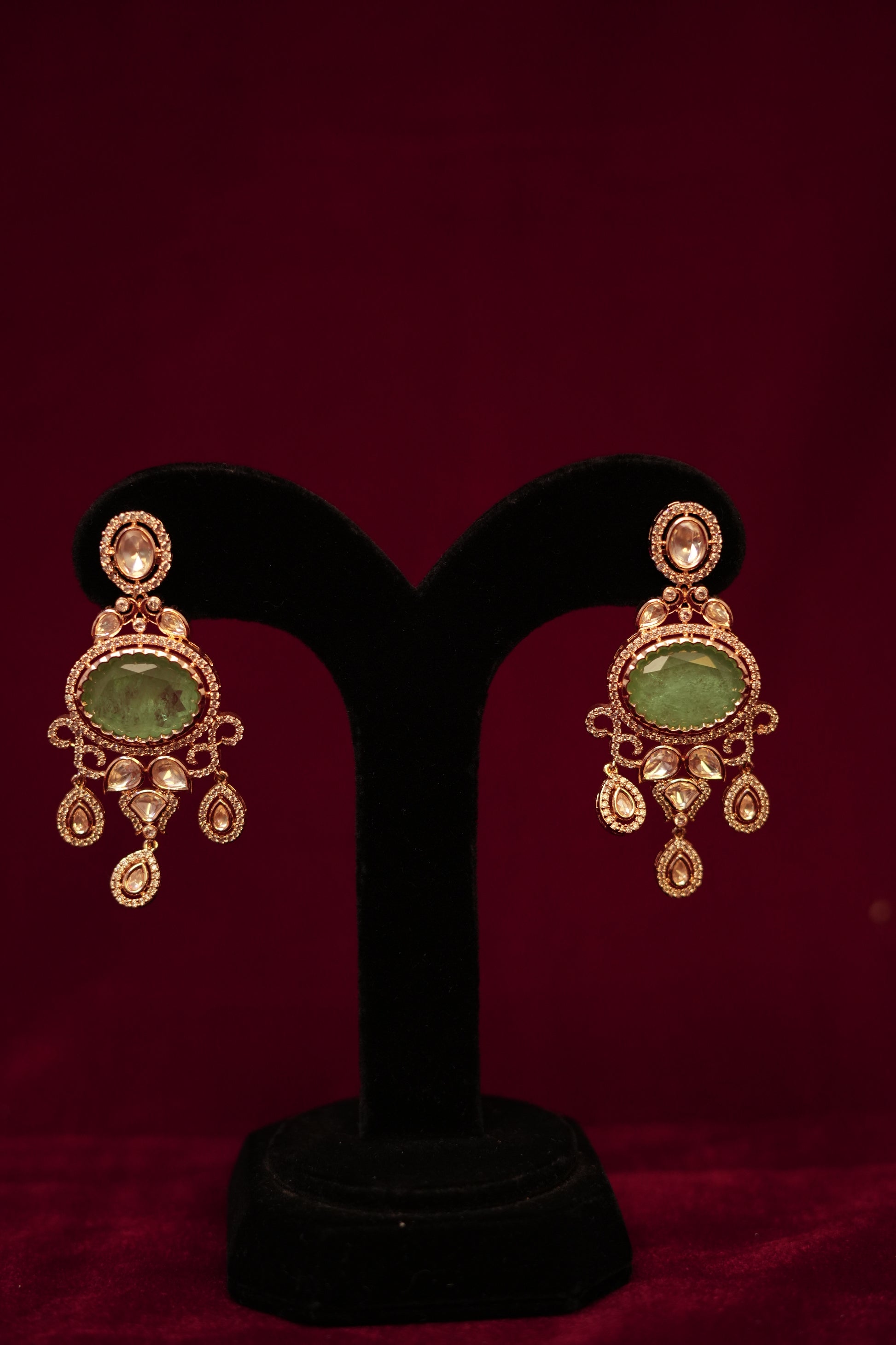 A graceful gold-finish necklace adorned with delicate heart-shaped polki links, highlighted by a rich oval emerald centerpiece. The pendant features intricate detailing with dangling teardrop motifs, paired with matching statement earrings for a timeless royal look.