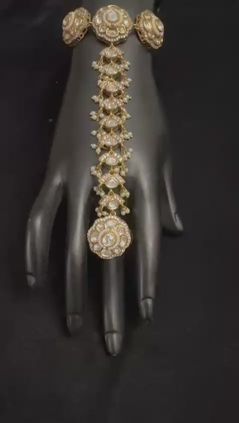 An exquisite Kundan Hathphool that gracefully bridges tradition and soul, weaving timeless elegance from the wrist to the fingertip.