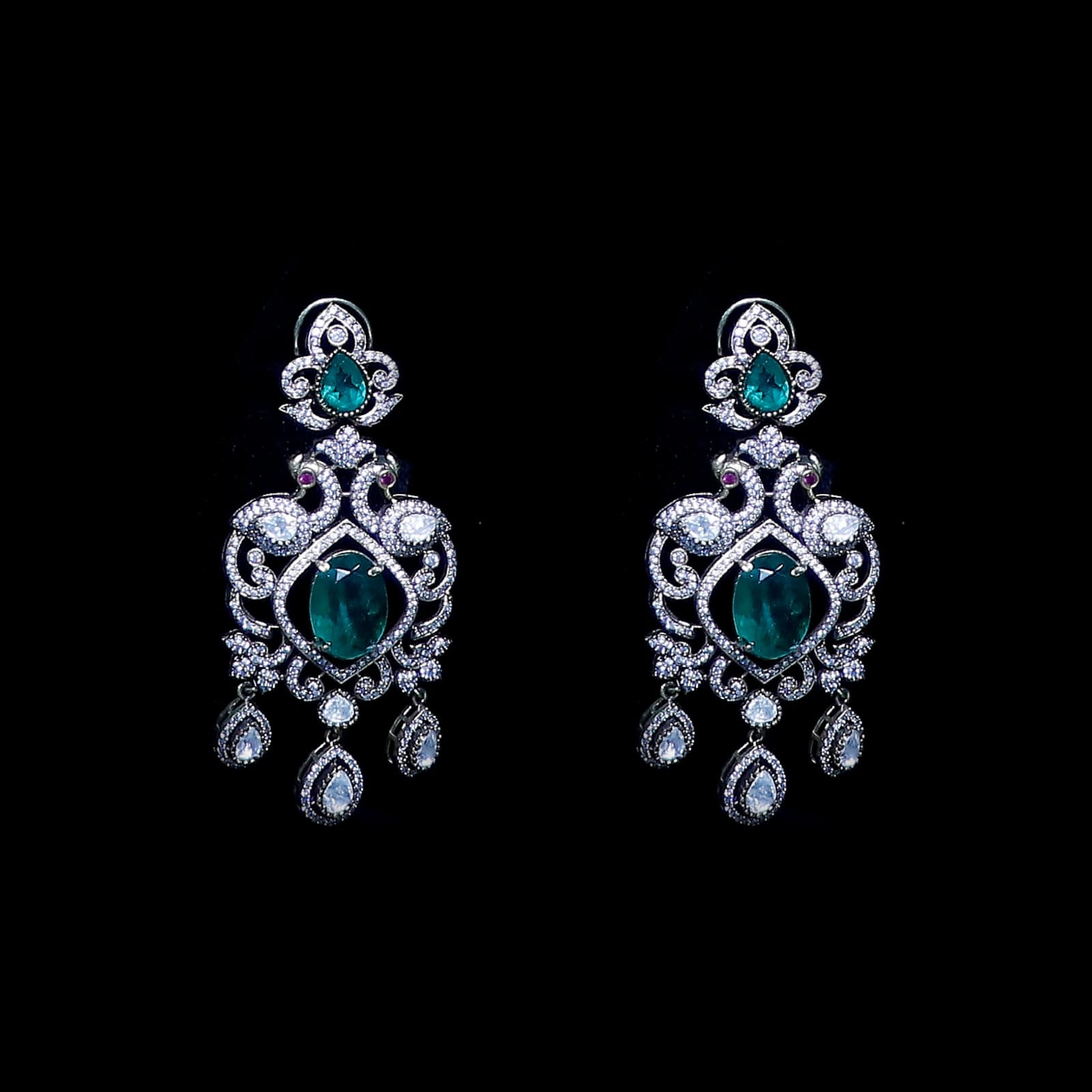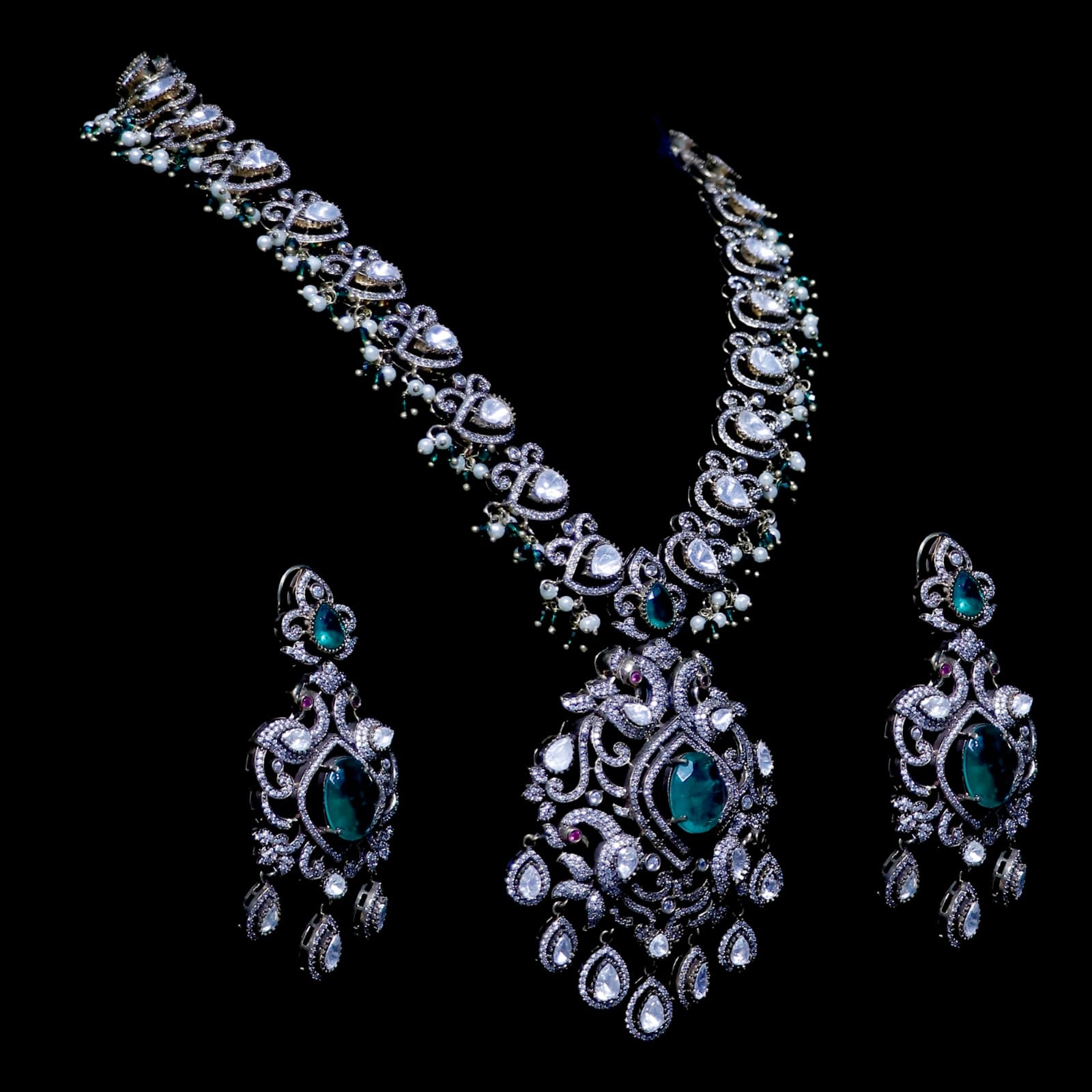 The necklace showcases a prominent, central emerald stone surrounded by intricate diamond work and a graduated design leading up to the chain, which is accented with small pearls or beads. The matching earrings echo the design with large emerald centers and elaborate diamond settings.